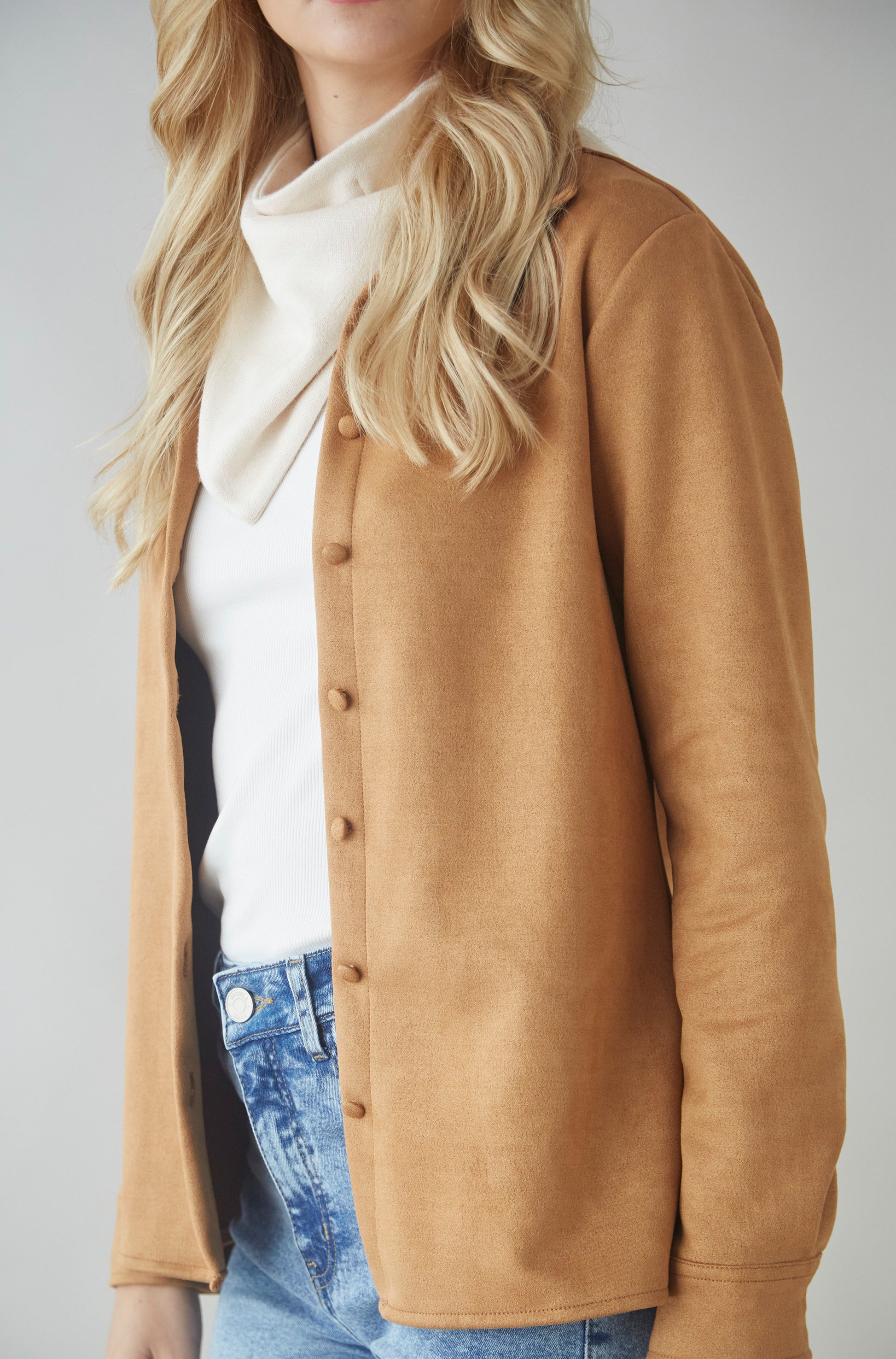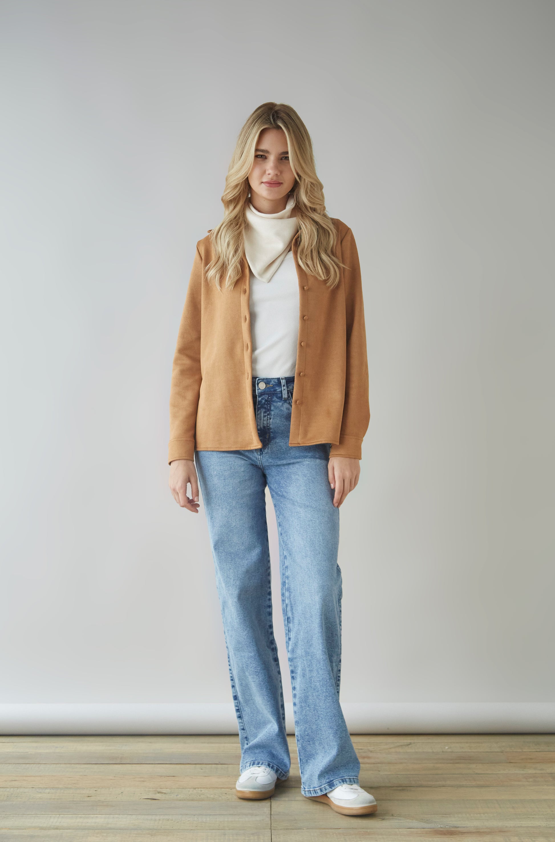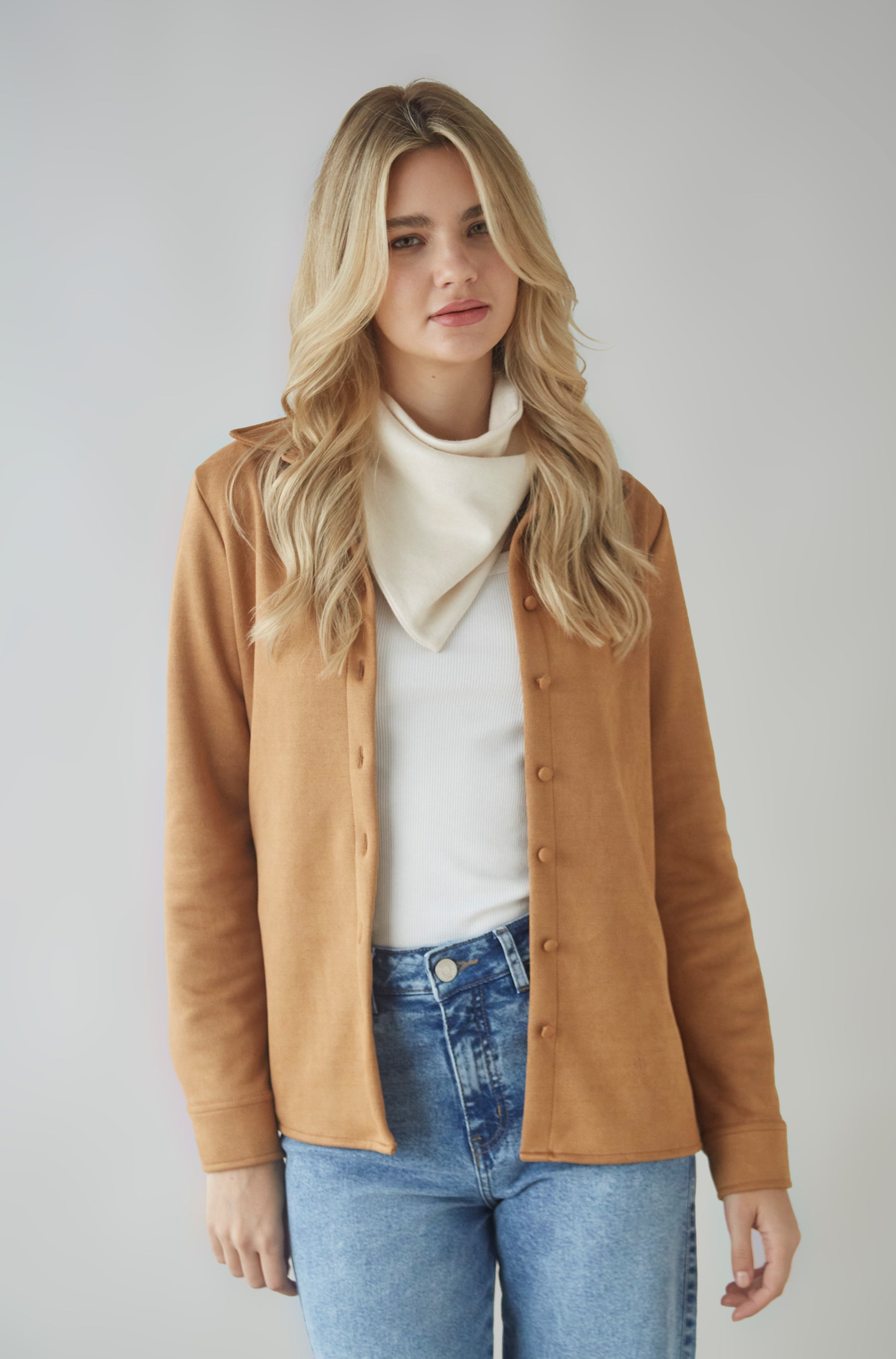 Blusa básica de cuello y solapa manga larga con botones forrados.