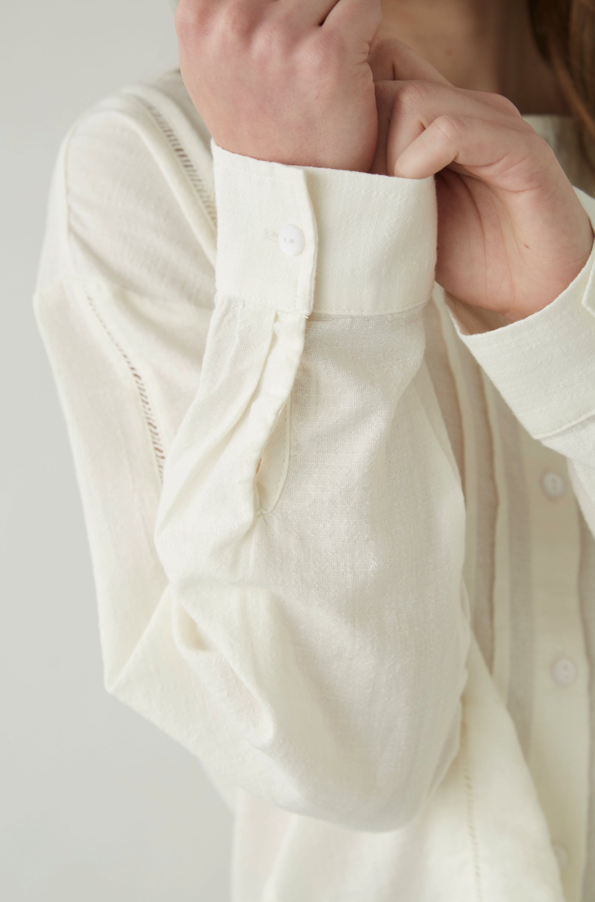 Blusa cuello redondo manga larga con detalle de bastas en el delantero.