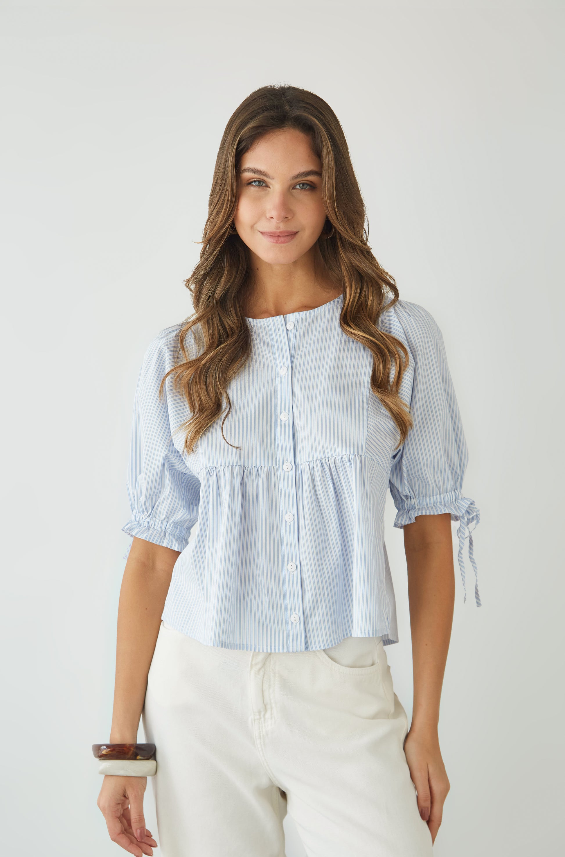 Blusa cuello redondo con botones manga al codo.