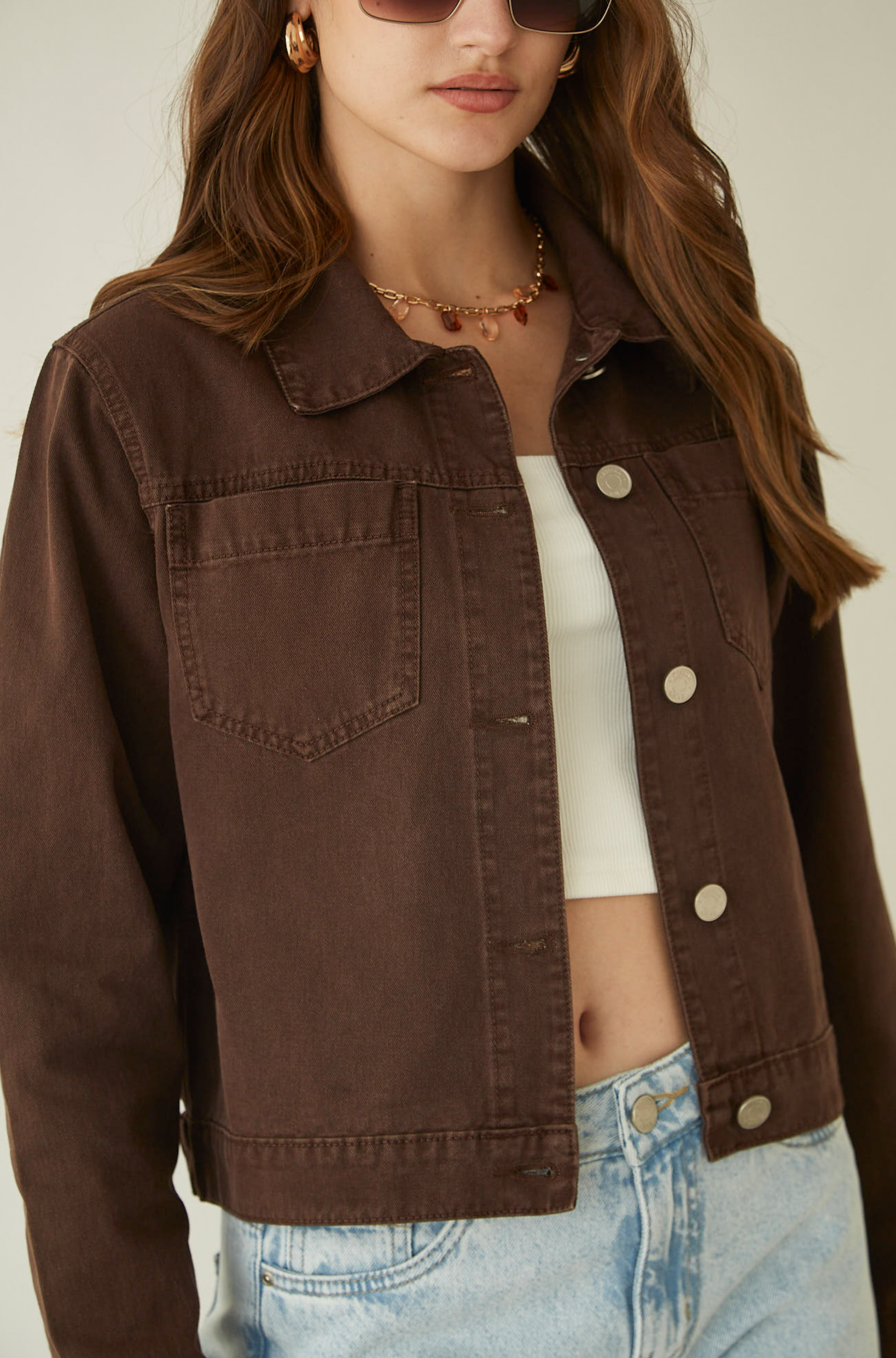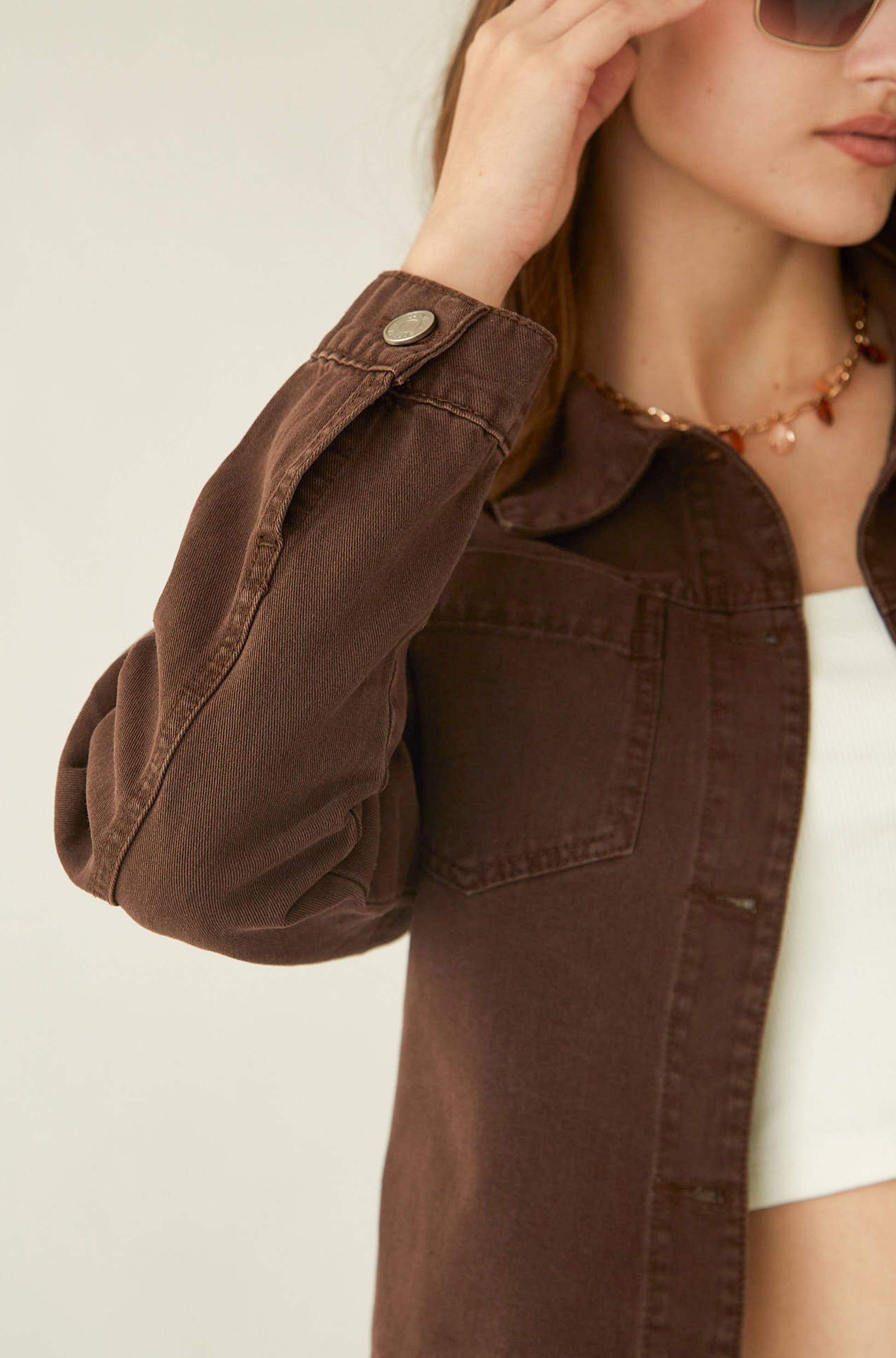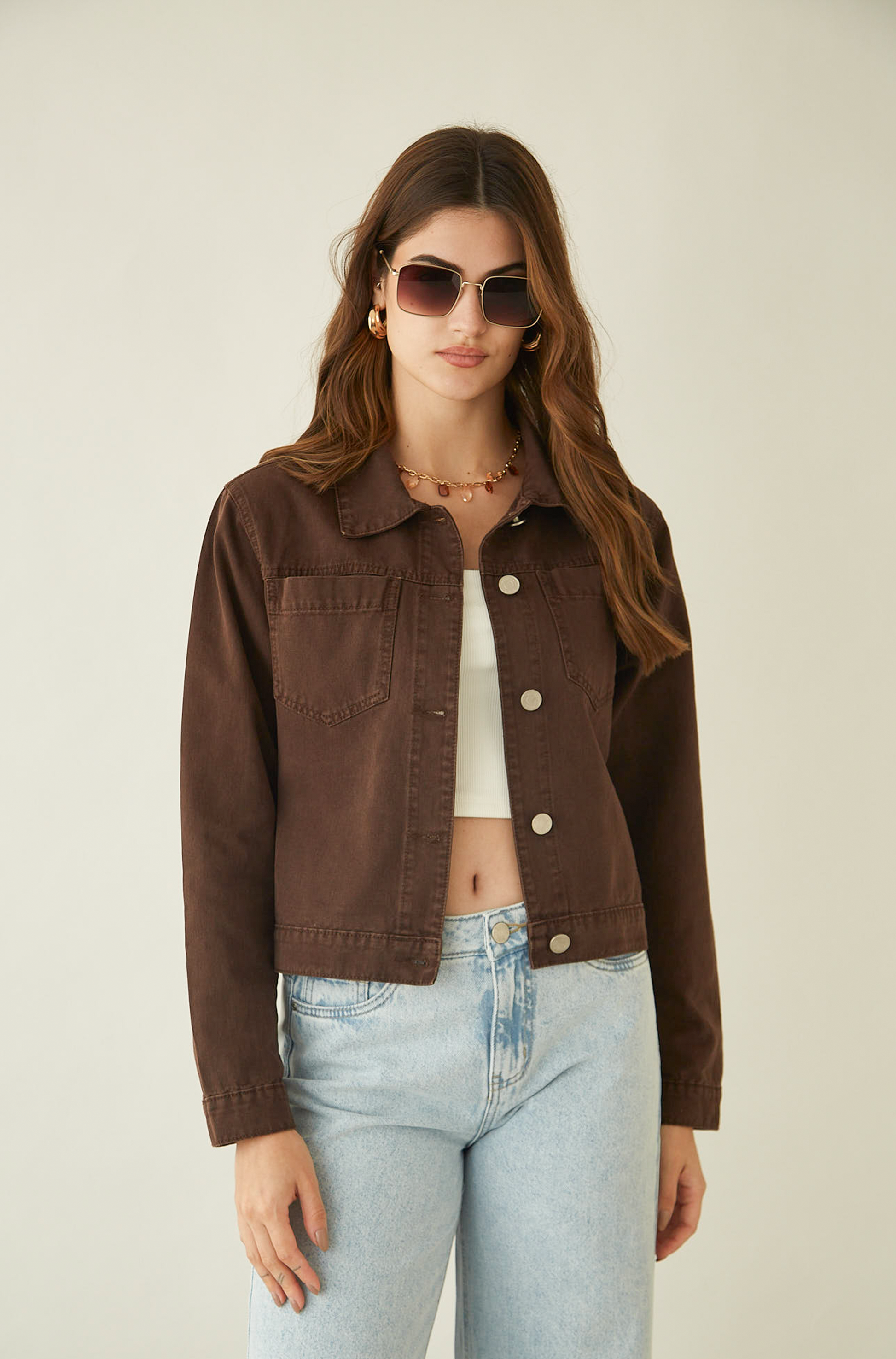 Casaca de cuello y solapa manga larga con dos bolsillos en delantero.