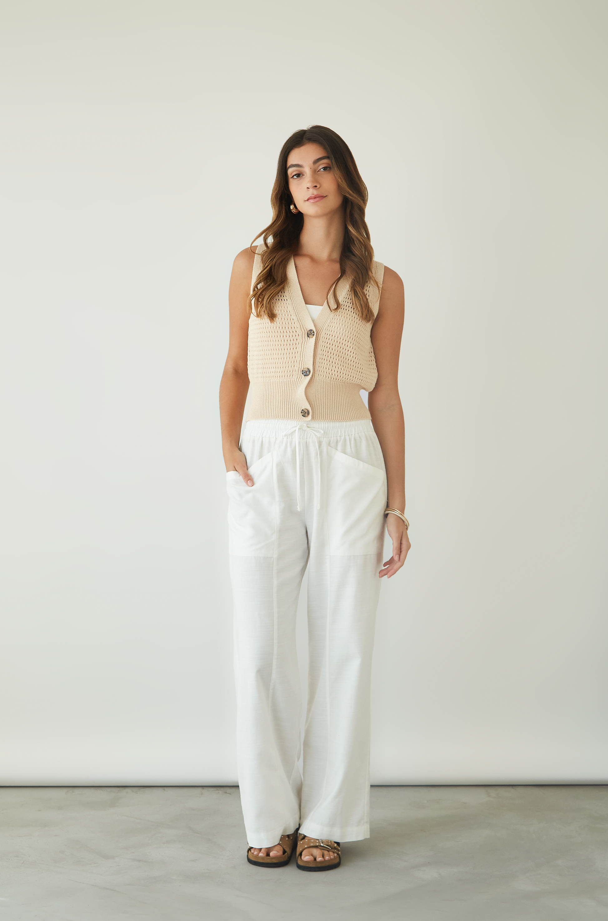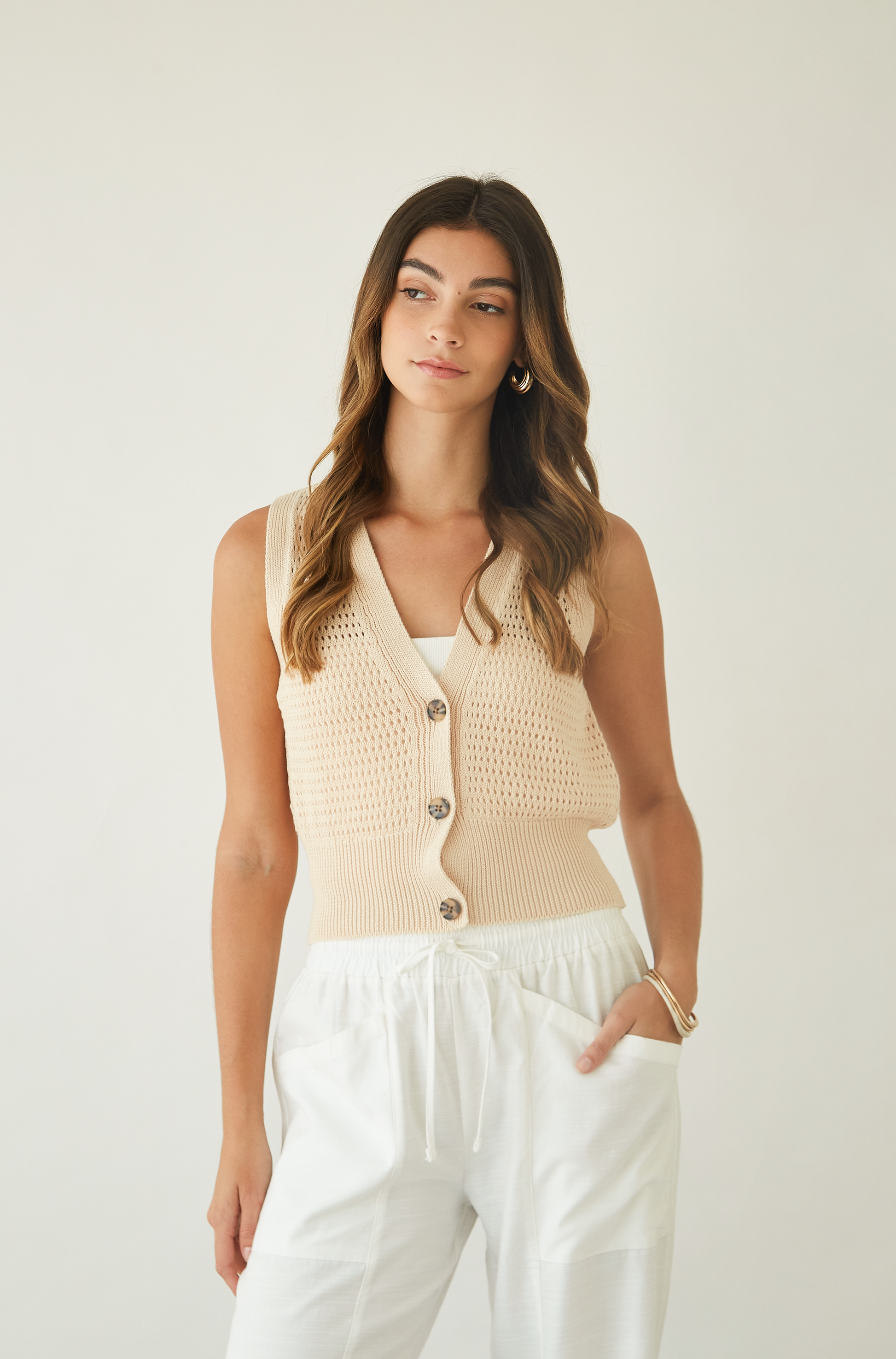 Chaleco tejido con pretina ancha y botines en delantero.