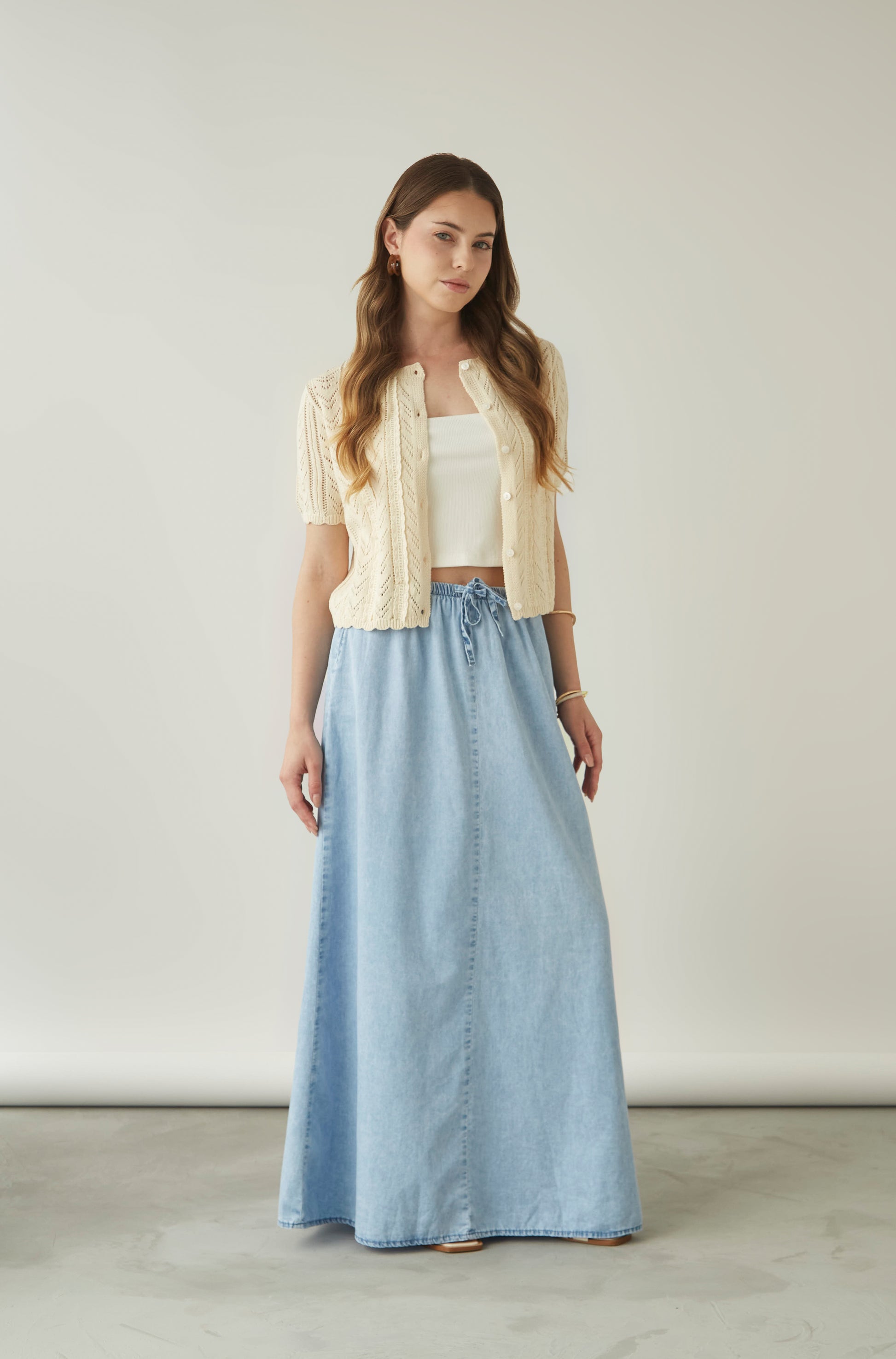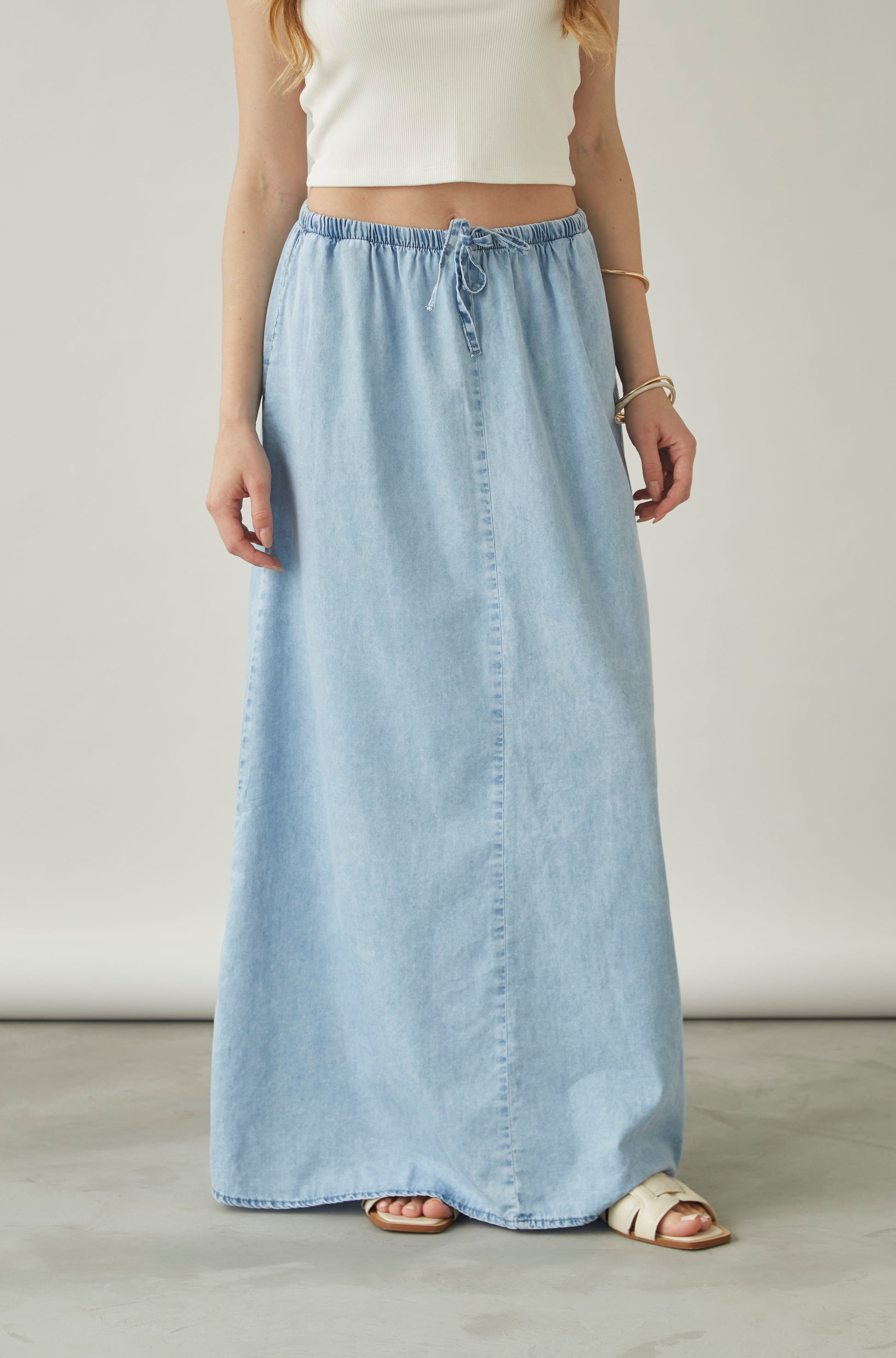 Falda maxi con bolsillos laterales y elasticada en cintura.