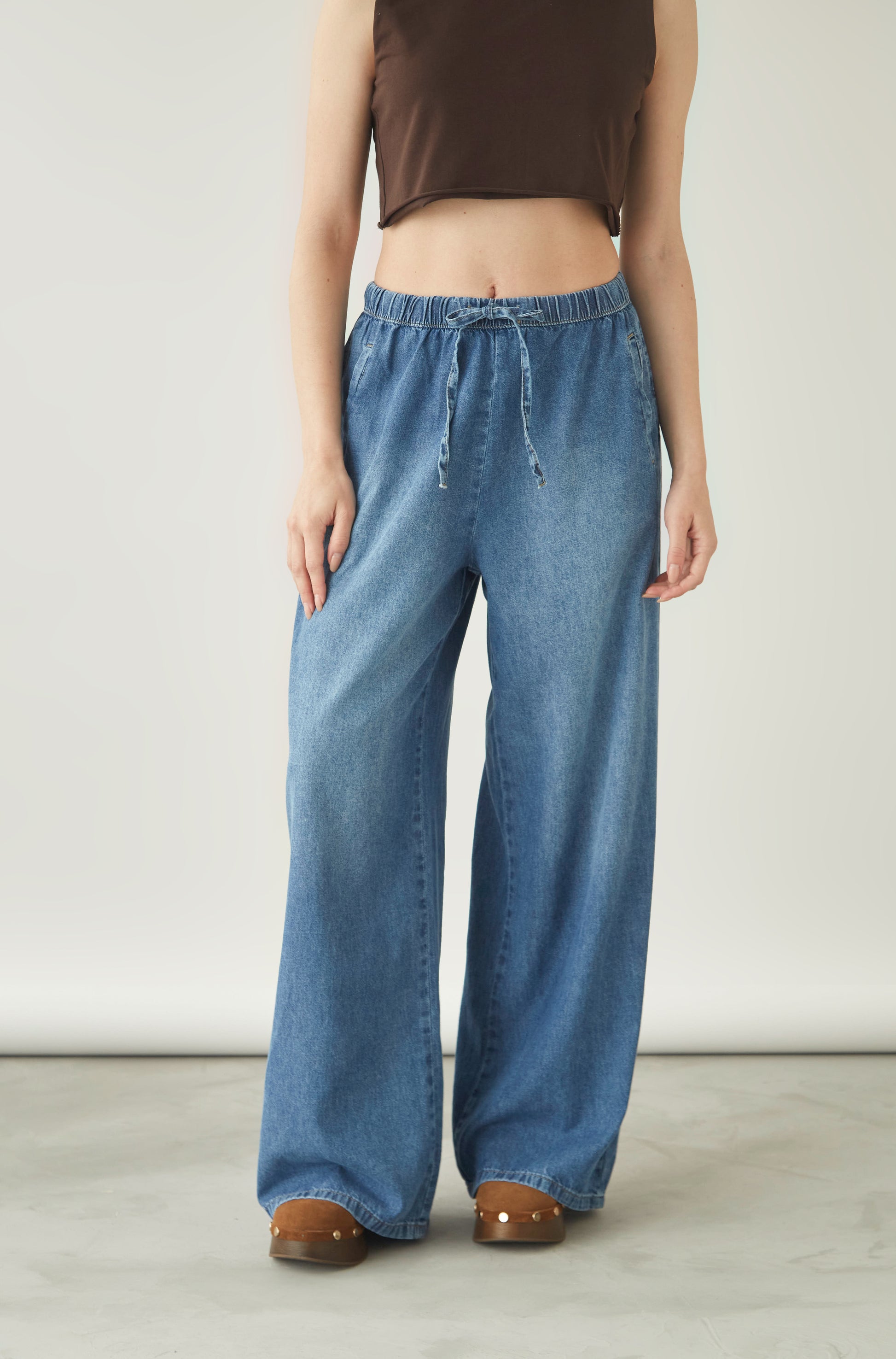 Jean wide leg con cintura elasticada y bolsillos laterales en delantero.