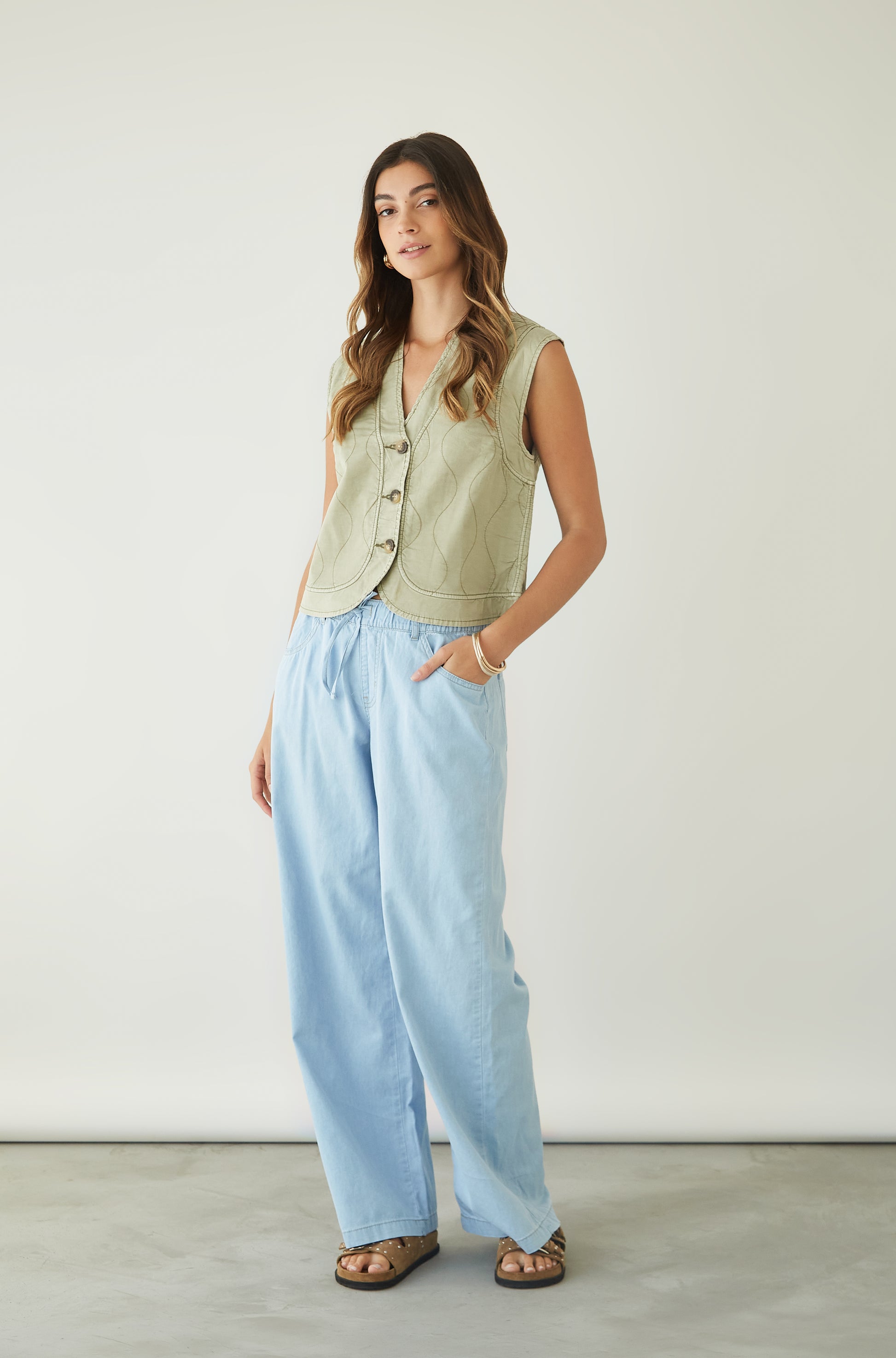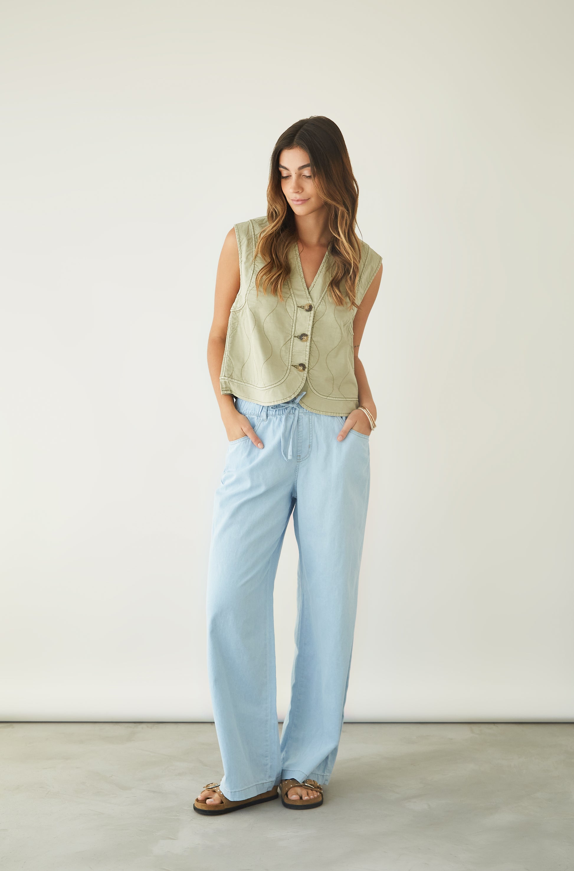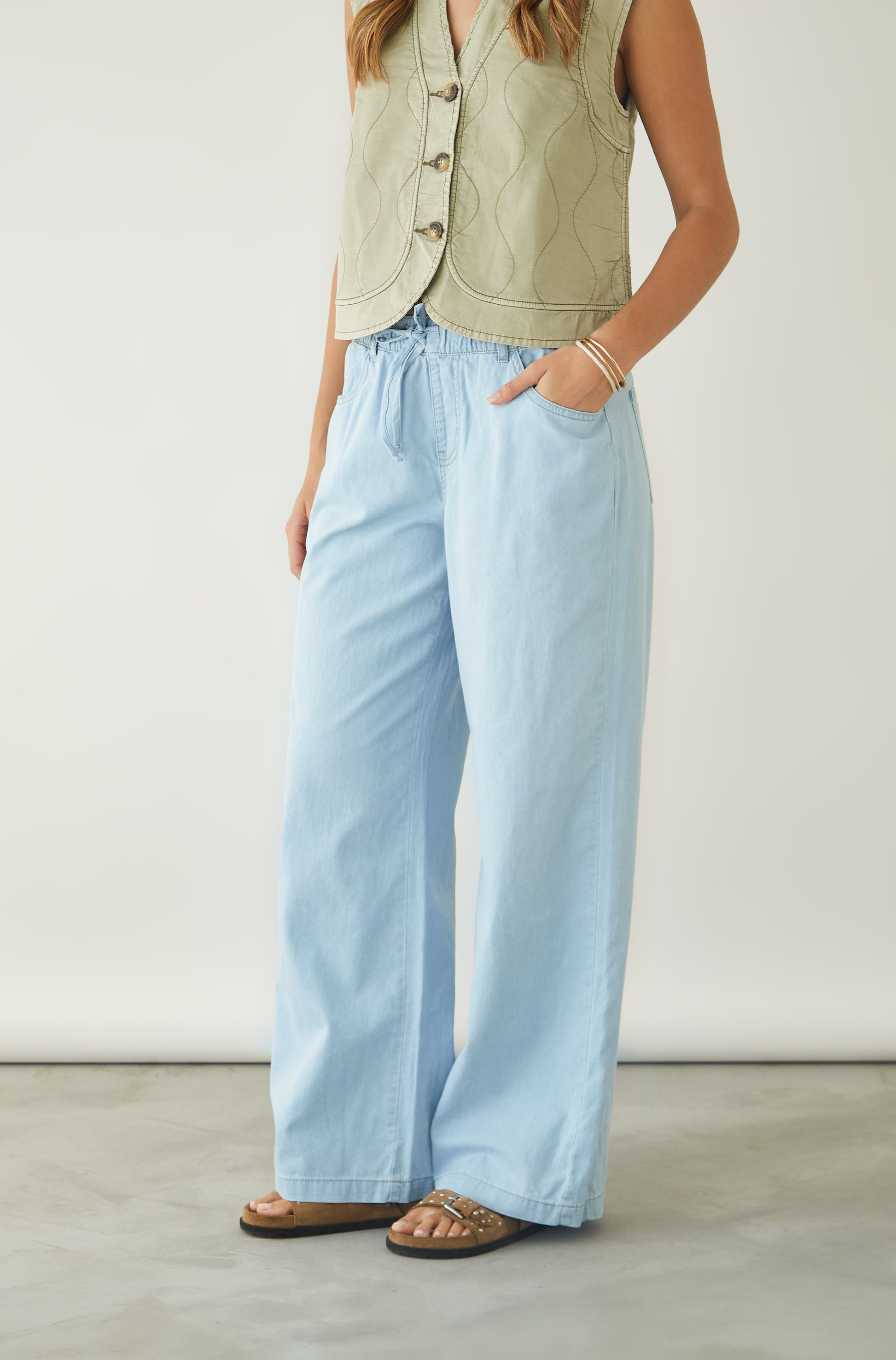 Jean Wide leg con bolsillos y cintura elasticada.