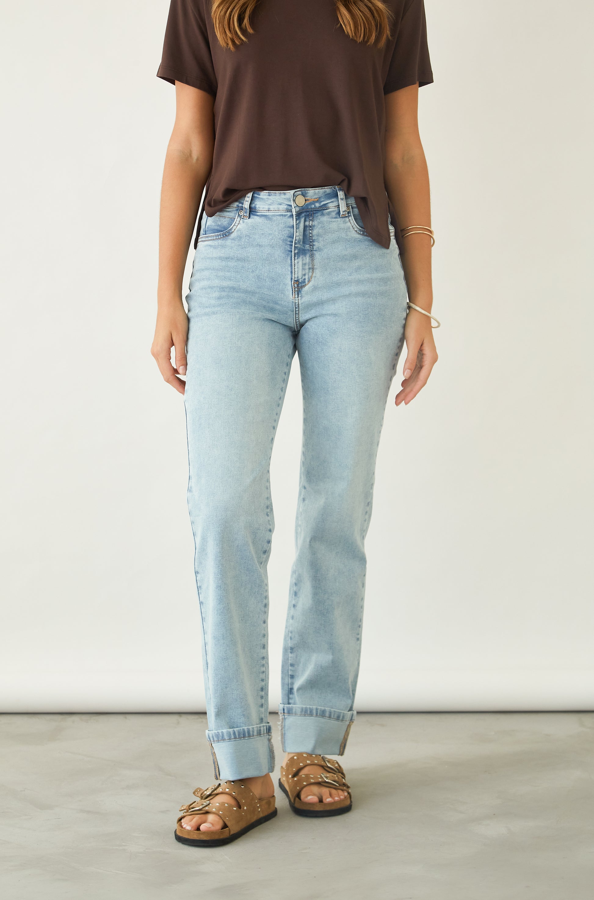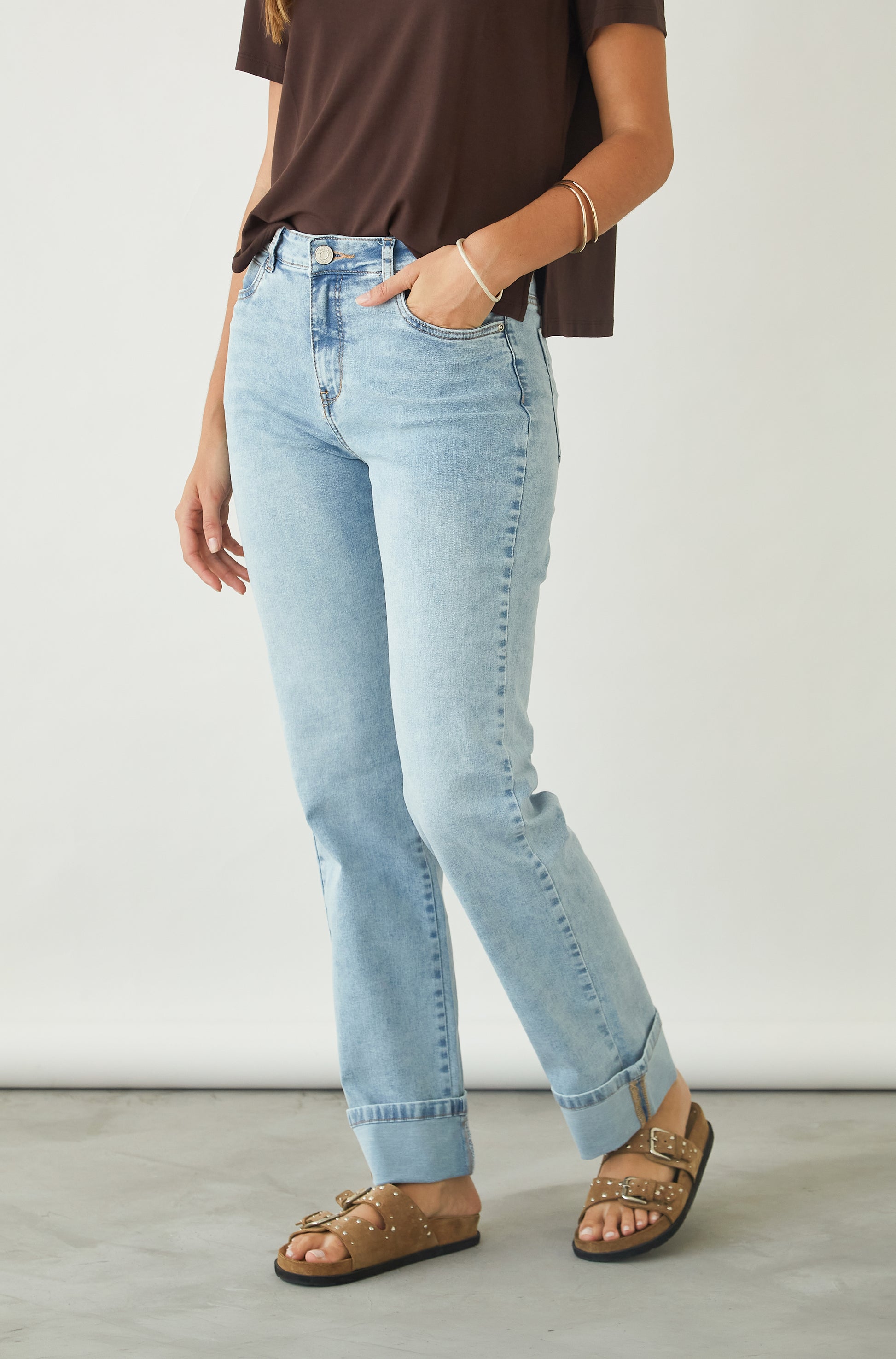 Jean recto 5 bolsillos y bajo acabado en vuelta.