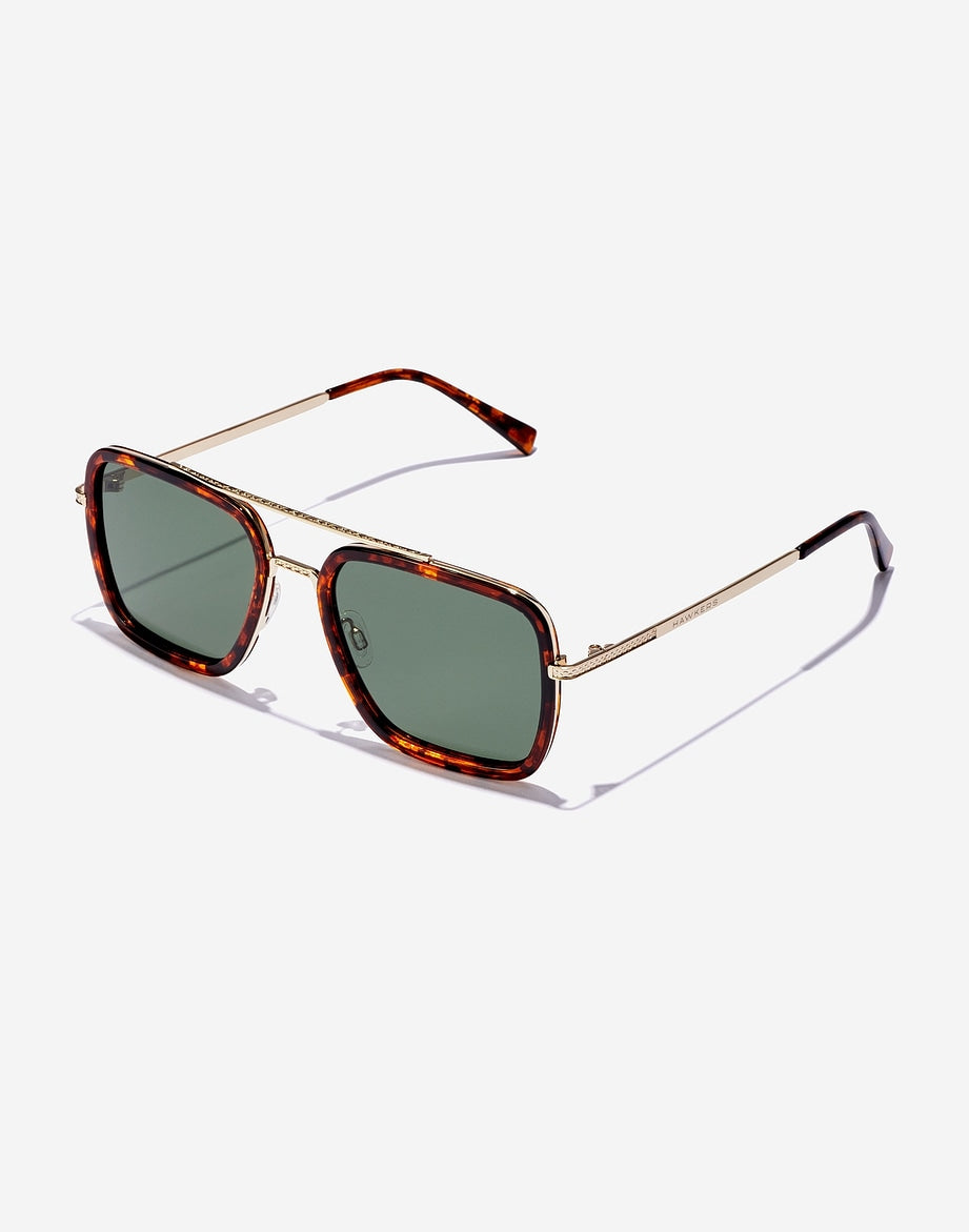Un diseño de aviador cuadrado con combinación de aros metálicos TR90, detalles a lo largo del puente metálico, barra superior y alrededor los puntos de articulación de las patillas. Este modelo de carey y oro tiene lentes polarizadas de color verde oscuro.