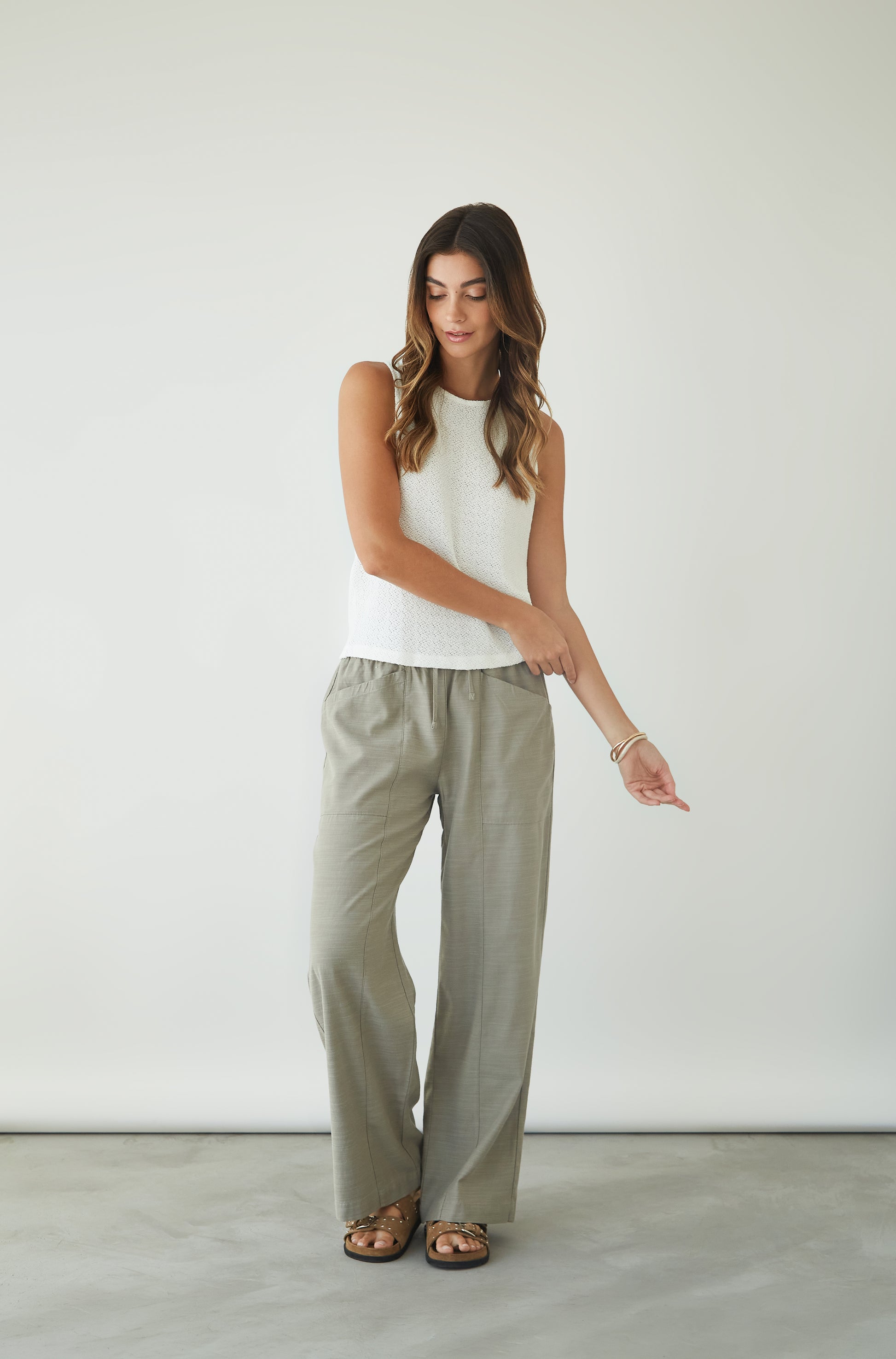 Pantalón tobillero con bolsillos parche en delantero y cintura elasticada.