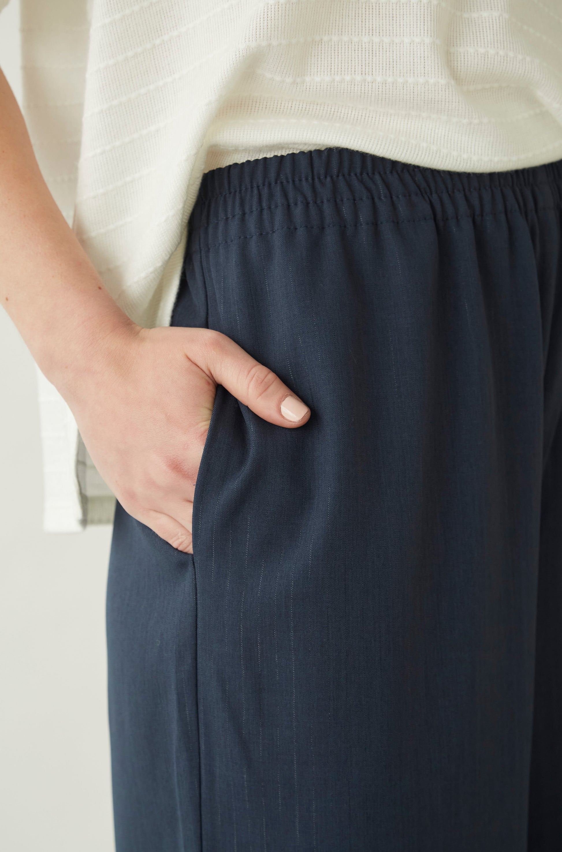 Pantalón wide leg con bolsillos laterales y cintura elasticada.