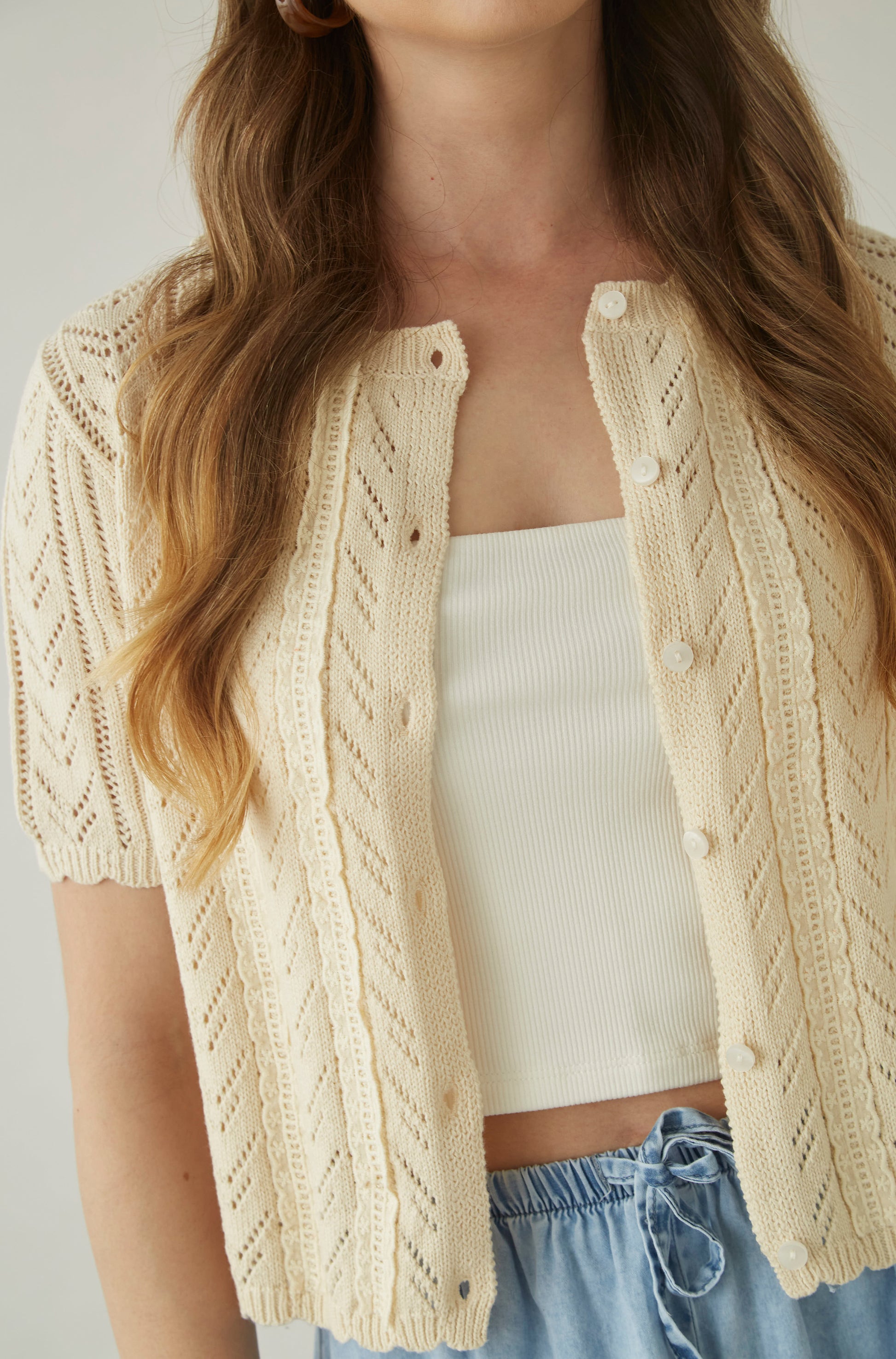 Chompa abierta cuello redondo y manga corta.