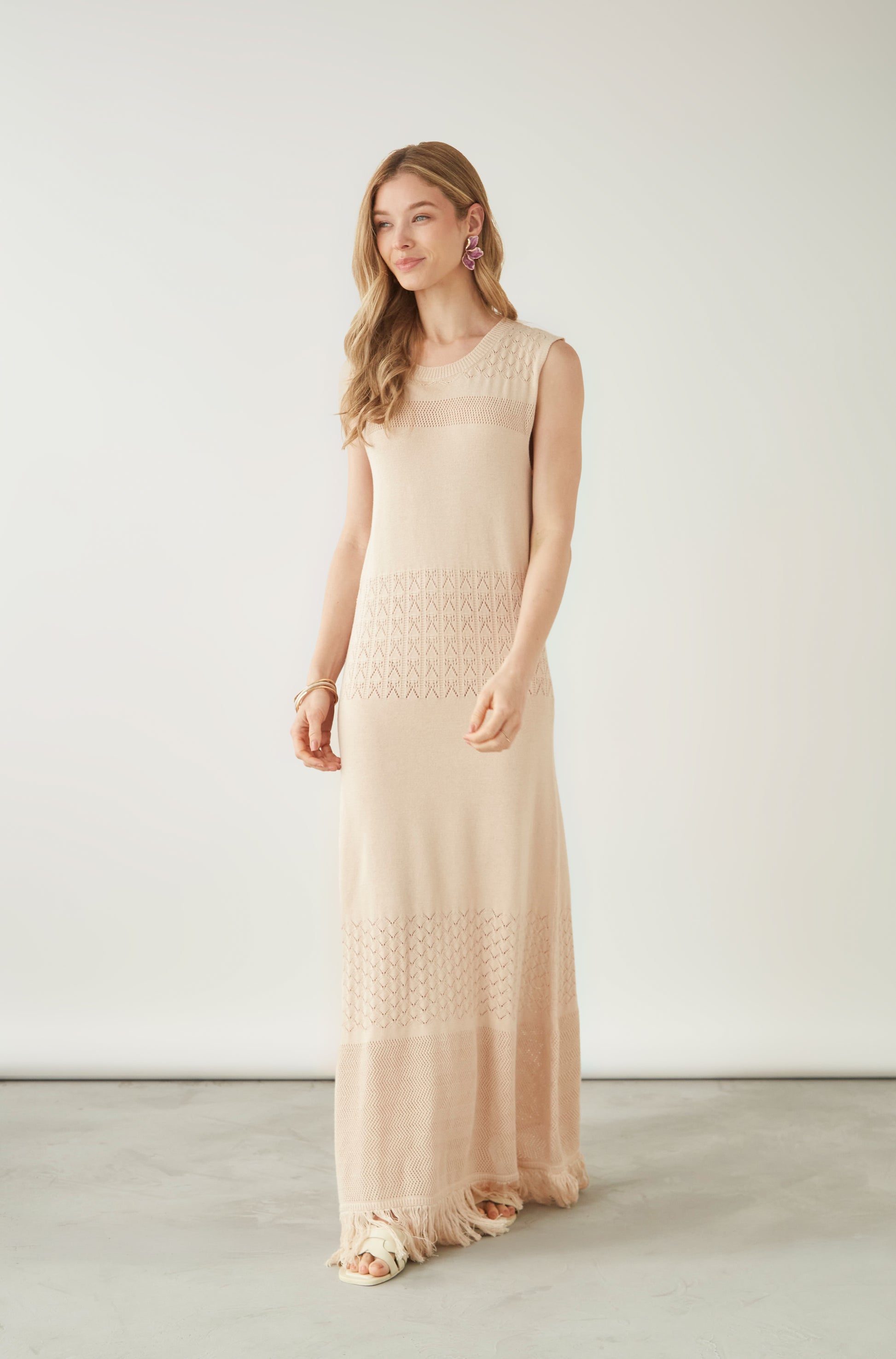 Vestido maxi cuello redondo sin mangas y con detalle de flecos en basta.