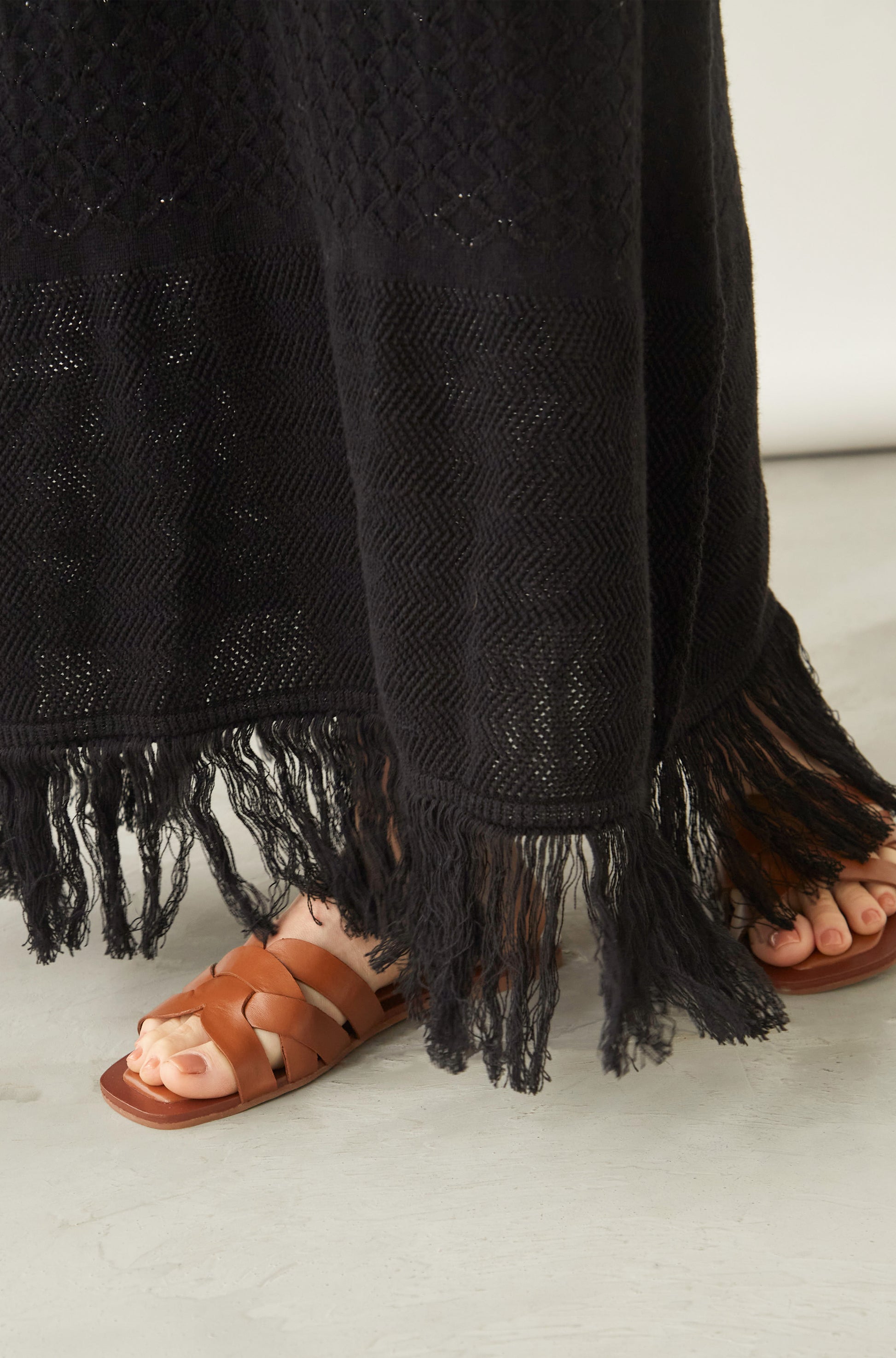 Vestido maxi cuello redondo sin mangas y con detalle de flecos en basta.